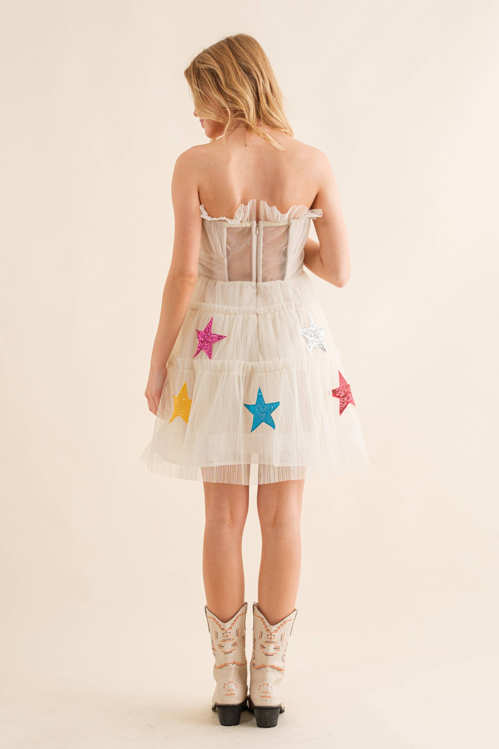 Pleated Tulle Mesh Tiered Tube Ruffle Star Sequin Patch Mini Dress