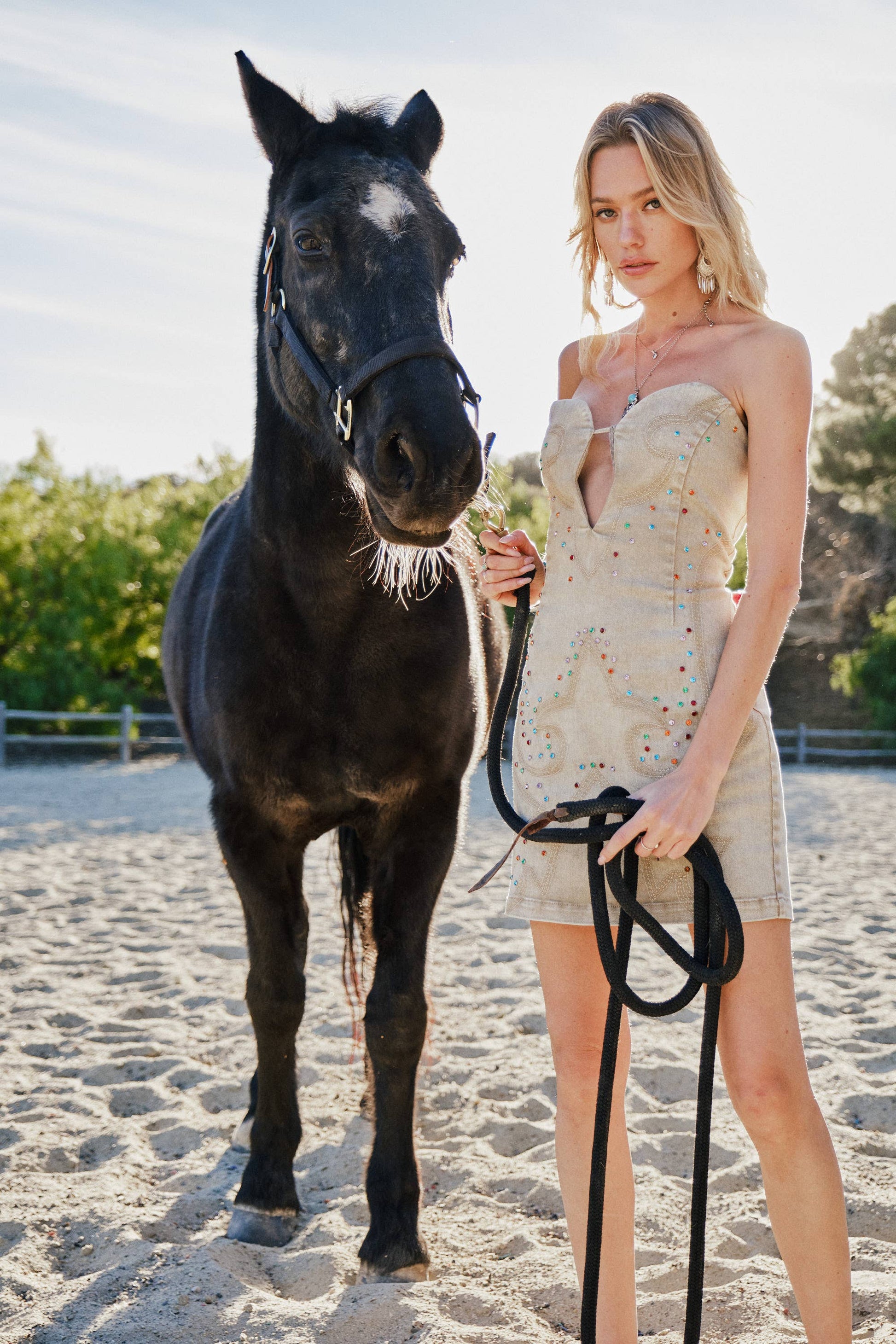 Garment-washed denim dress with intricate stitchwork and embroidery. Sweetheart neckline with wire detail.