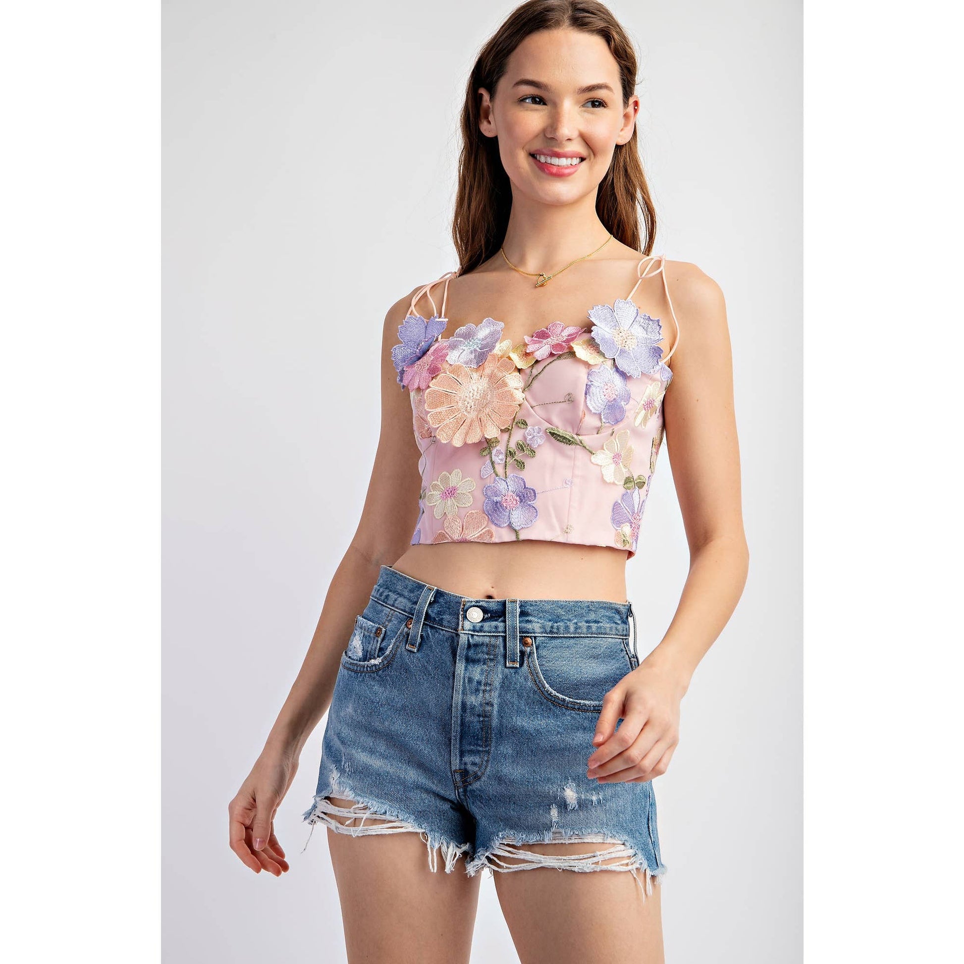* SBeautiful embroidery floral corset tank top - Lace up back side - Fully lined - Elastic spaghetti used on shoulder strap and back side - Model in heather grey is 5' 8" 32-23-34 and wearing a Small