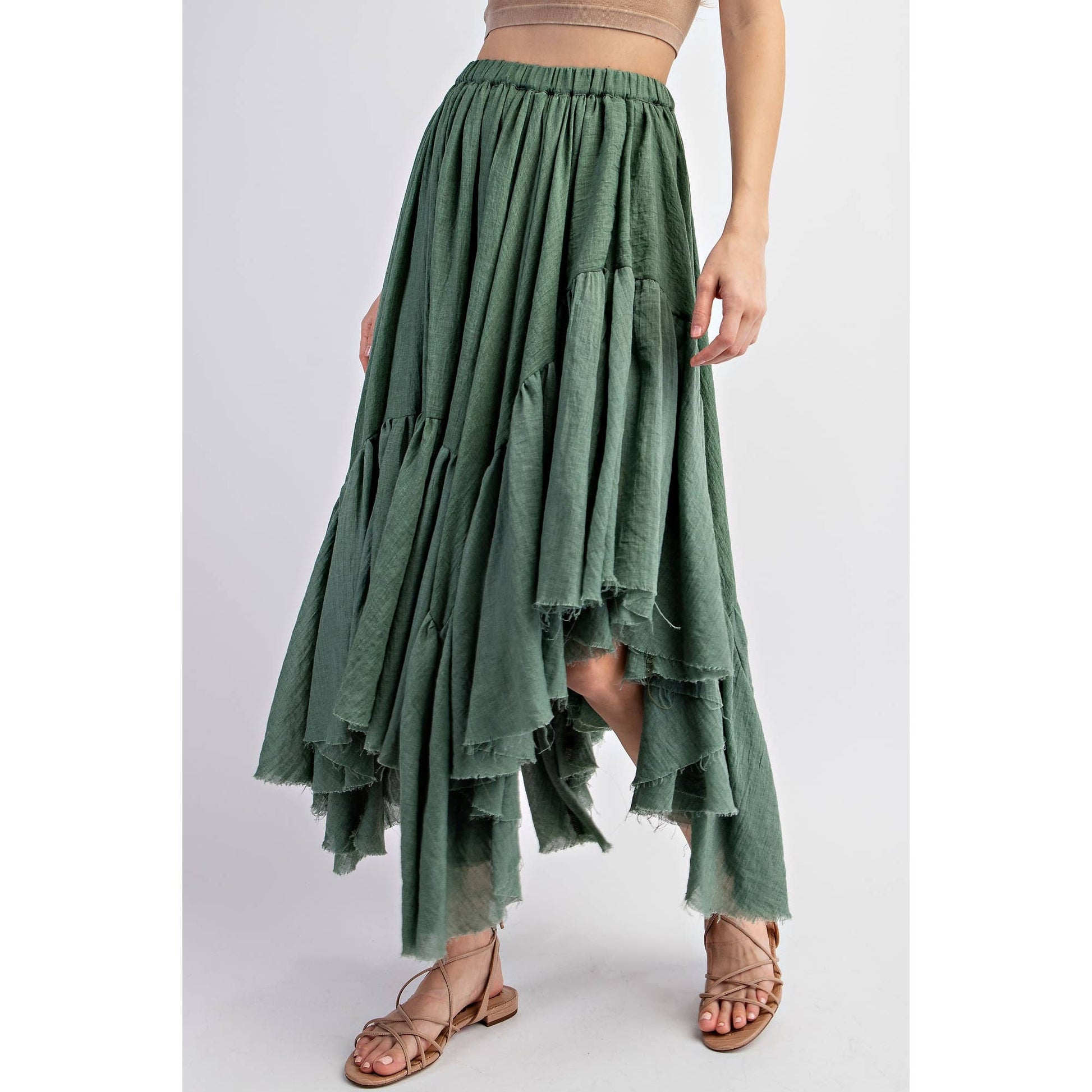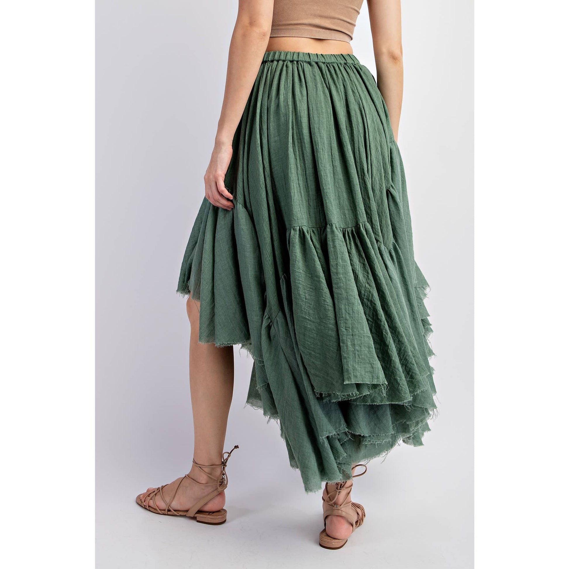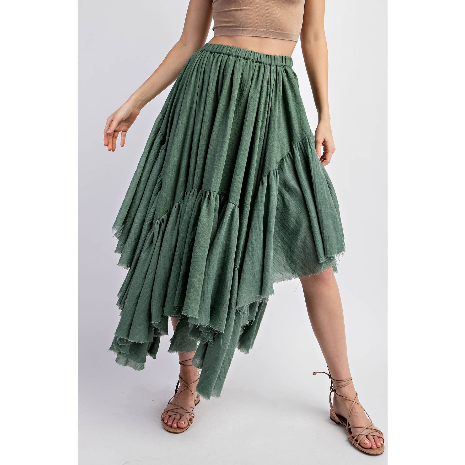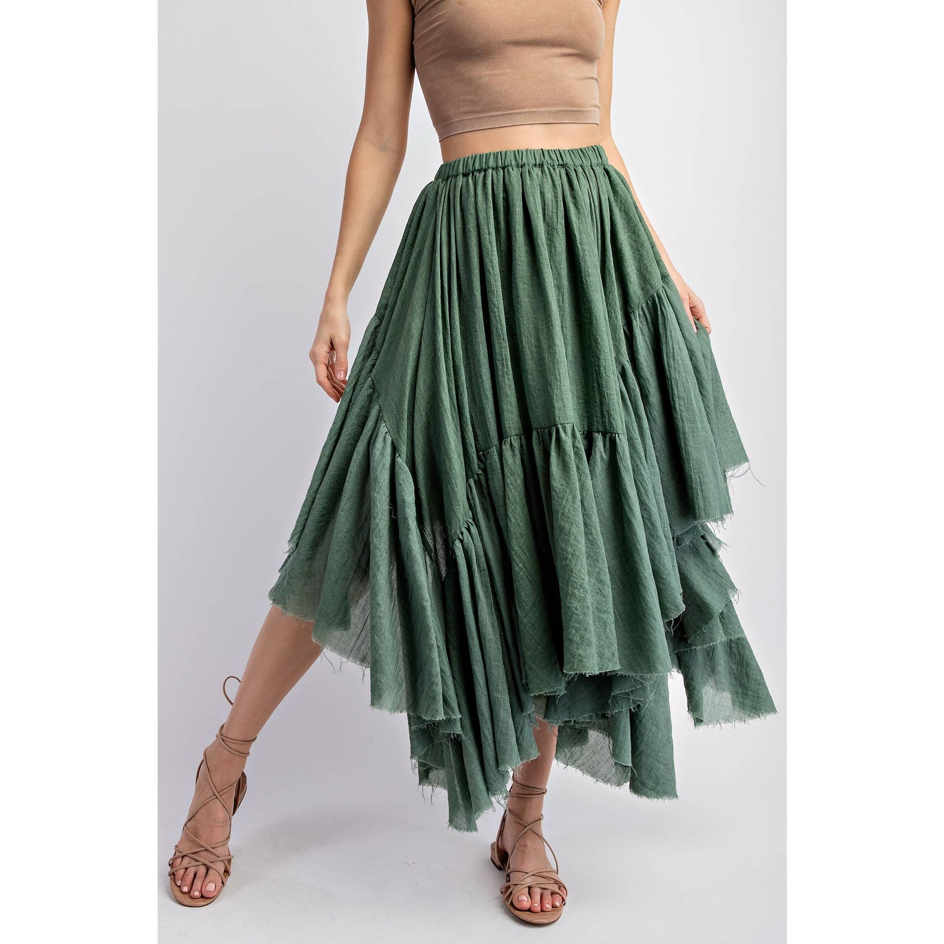 ASYMMETRICAL RAW-EDGE RUCHED UNEVEN HEMLINE SKIRT: Olive