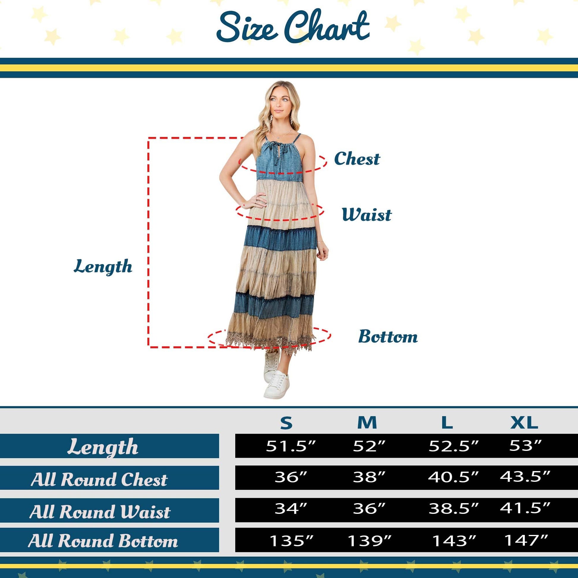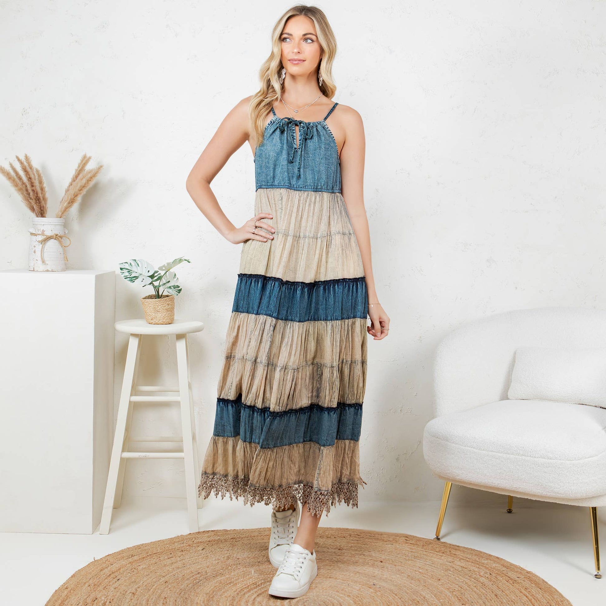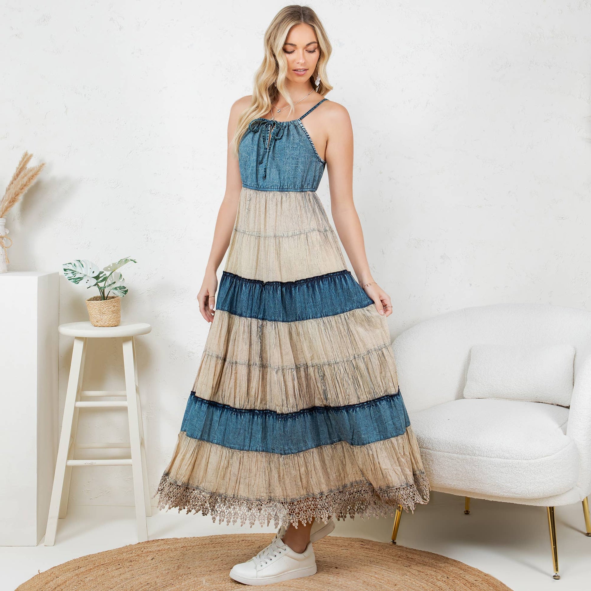 • Details: Boho-inspired halter neck dress with tiered layers, featuring denim and cotton fabric, patchwork detailing, and a breezy, relaxed fit for ultimate comfort and style