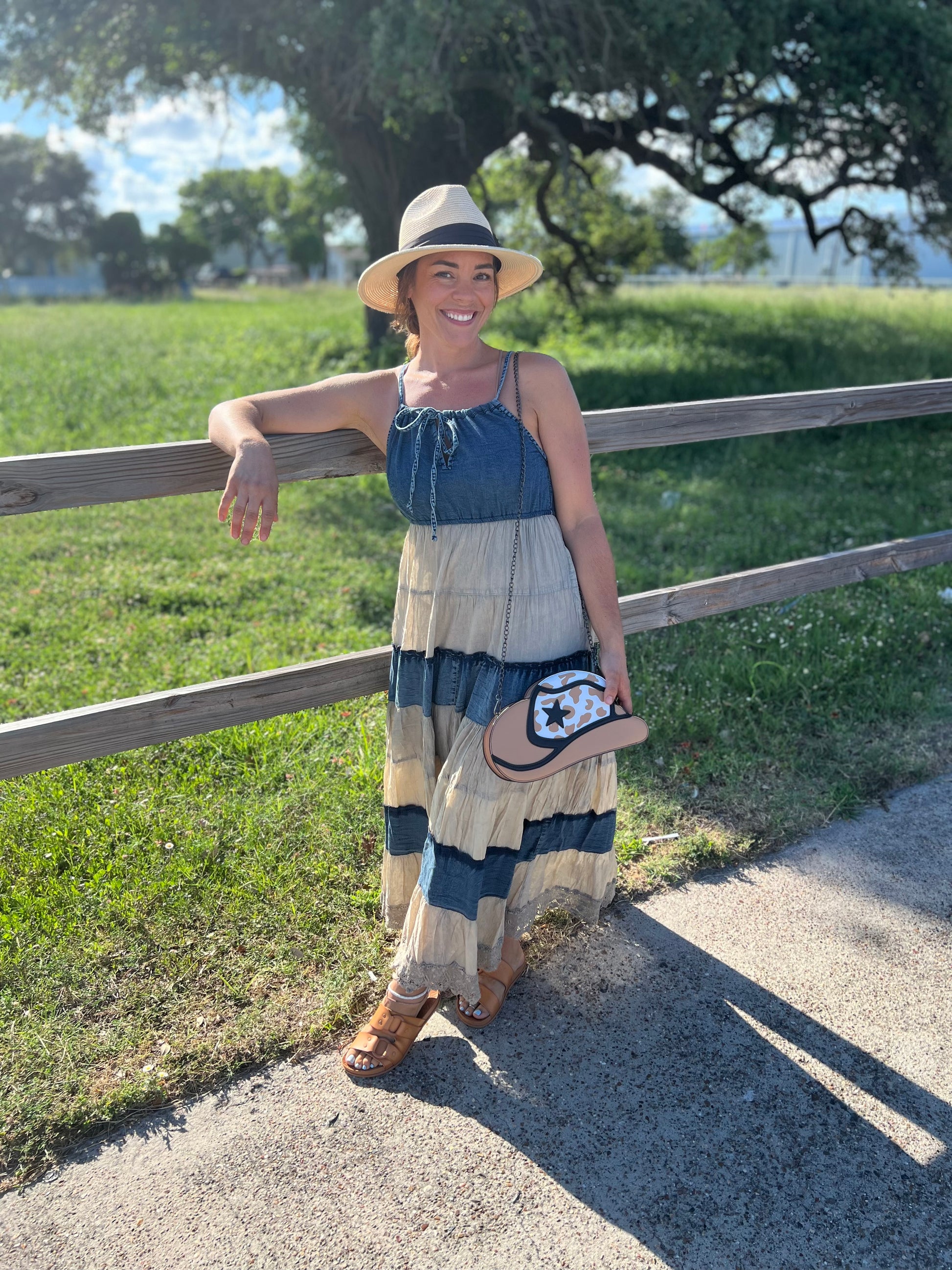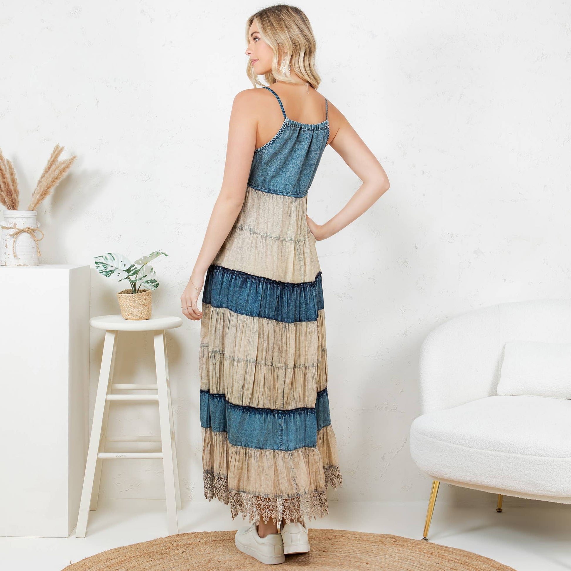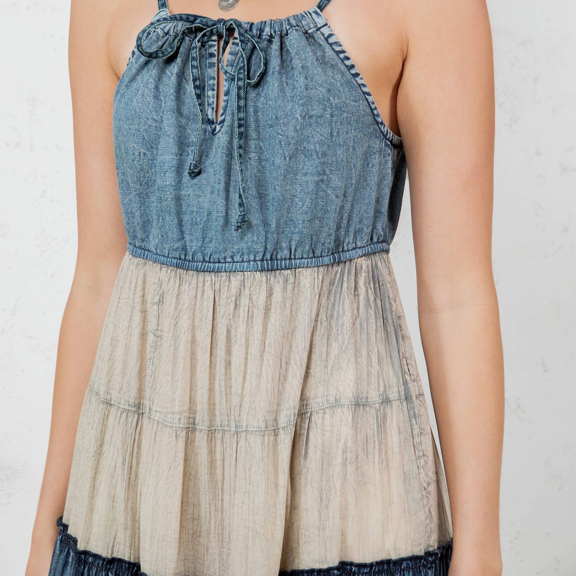 • Details: Boho-inspired halter neck dress with tiered layers, featuring denim and cotton fabric, patchwork detailing, and a breezy, relaxed fit for ultimate comfort and style