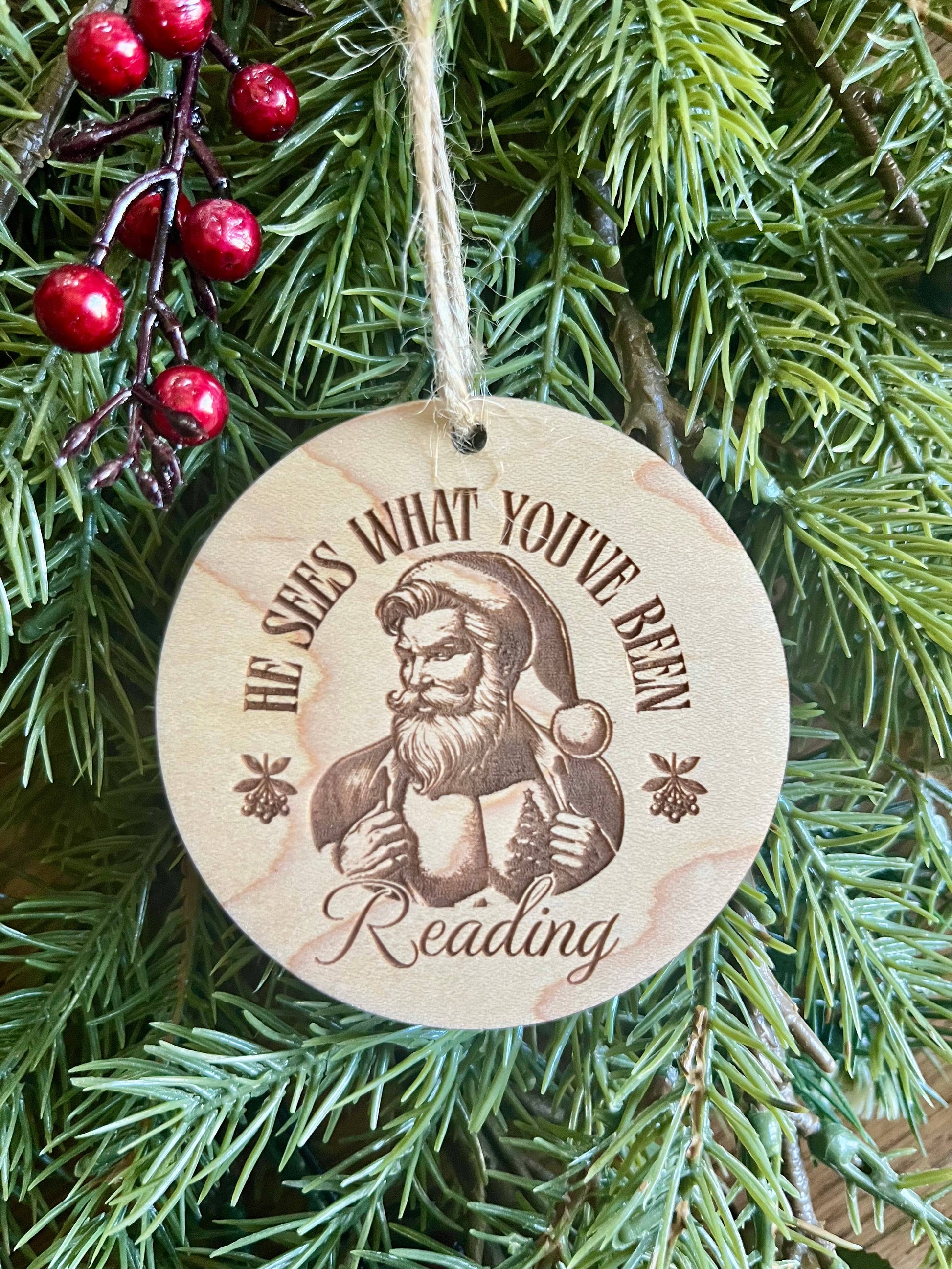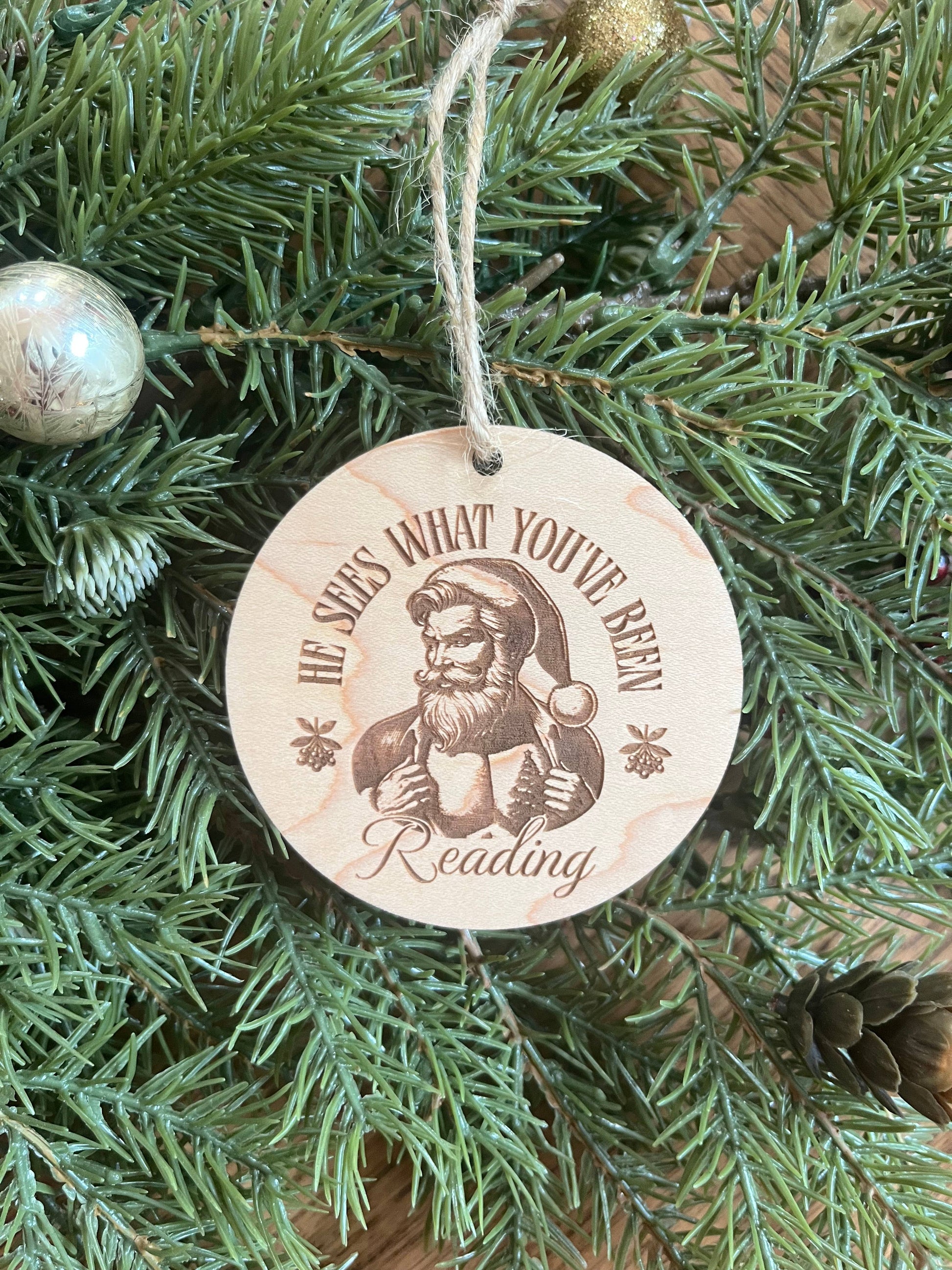 Perfect ornament for bookish lovers! This ornament comes with 2mm twine so that it can be put on the tree as soon as it gets to your door. |Ornament details| Size: 3" diameter Wood: 1/4" thick maple plywood Stain color: Natural Handcrafted with care, this ornament reflects the artistry of handmade craftsmanship and the enduring allure of classic elegance. It's a perfect addition to your seasonal decorations, bringing a touch of refinement and storytelling to your home.