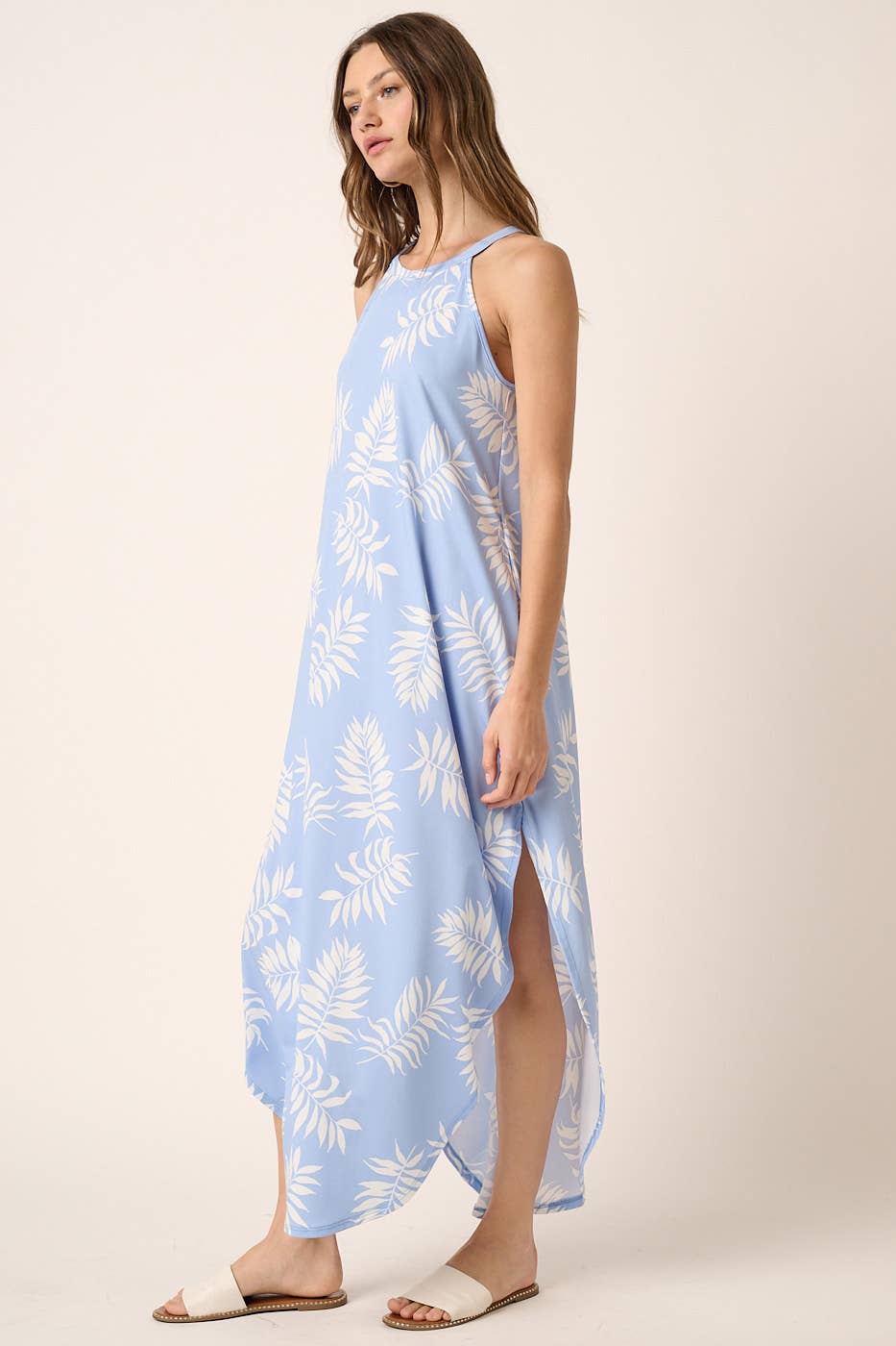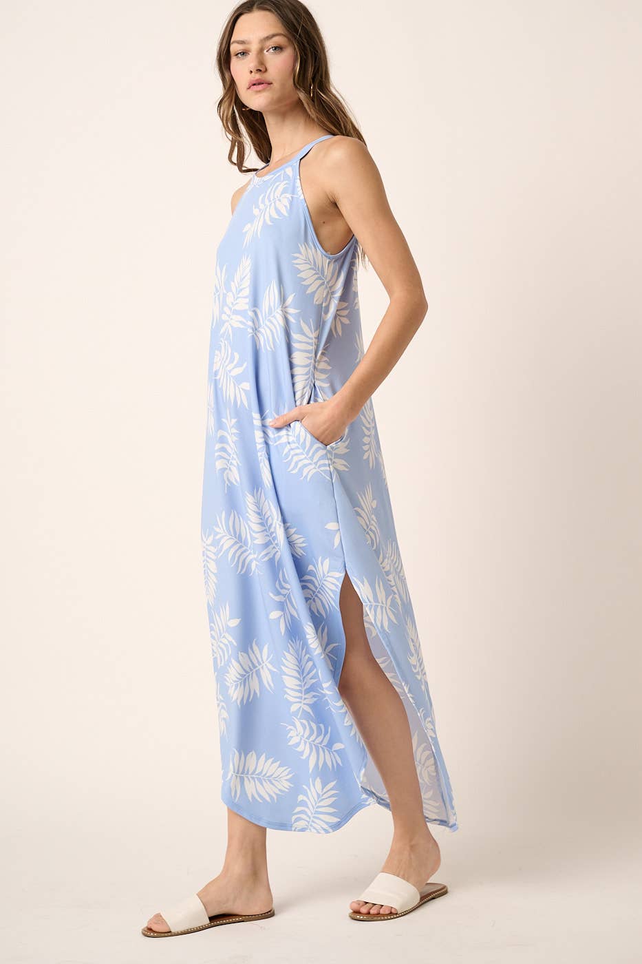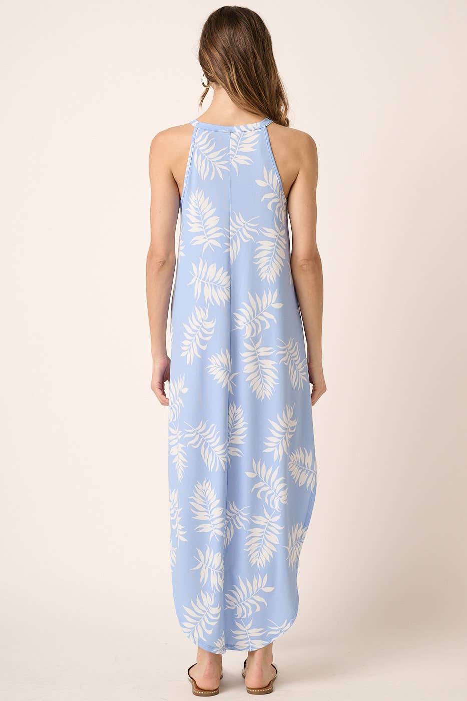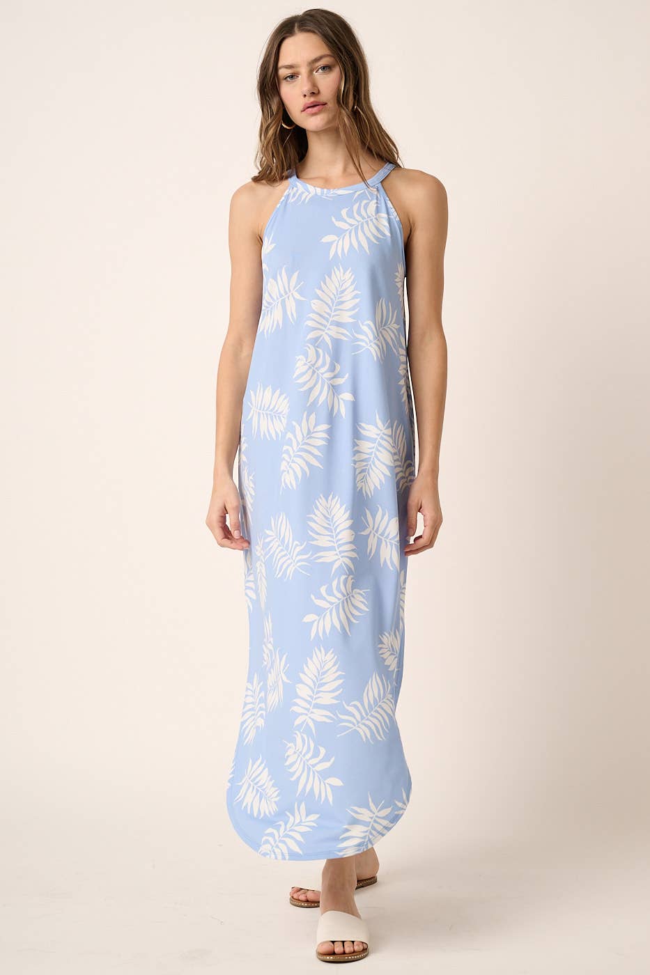 LEAF PRINT HALTER MAXI DRESS: BLUE
