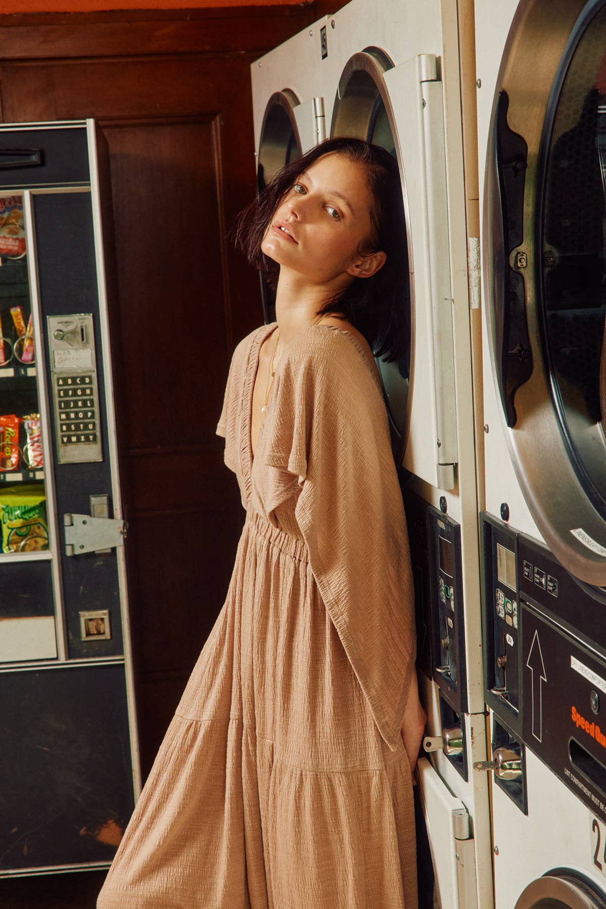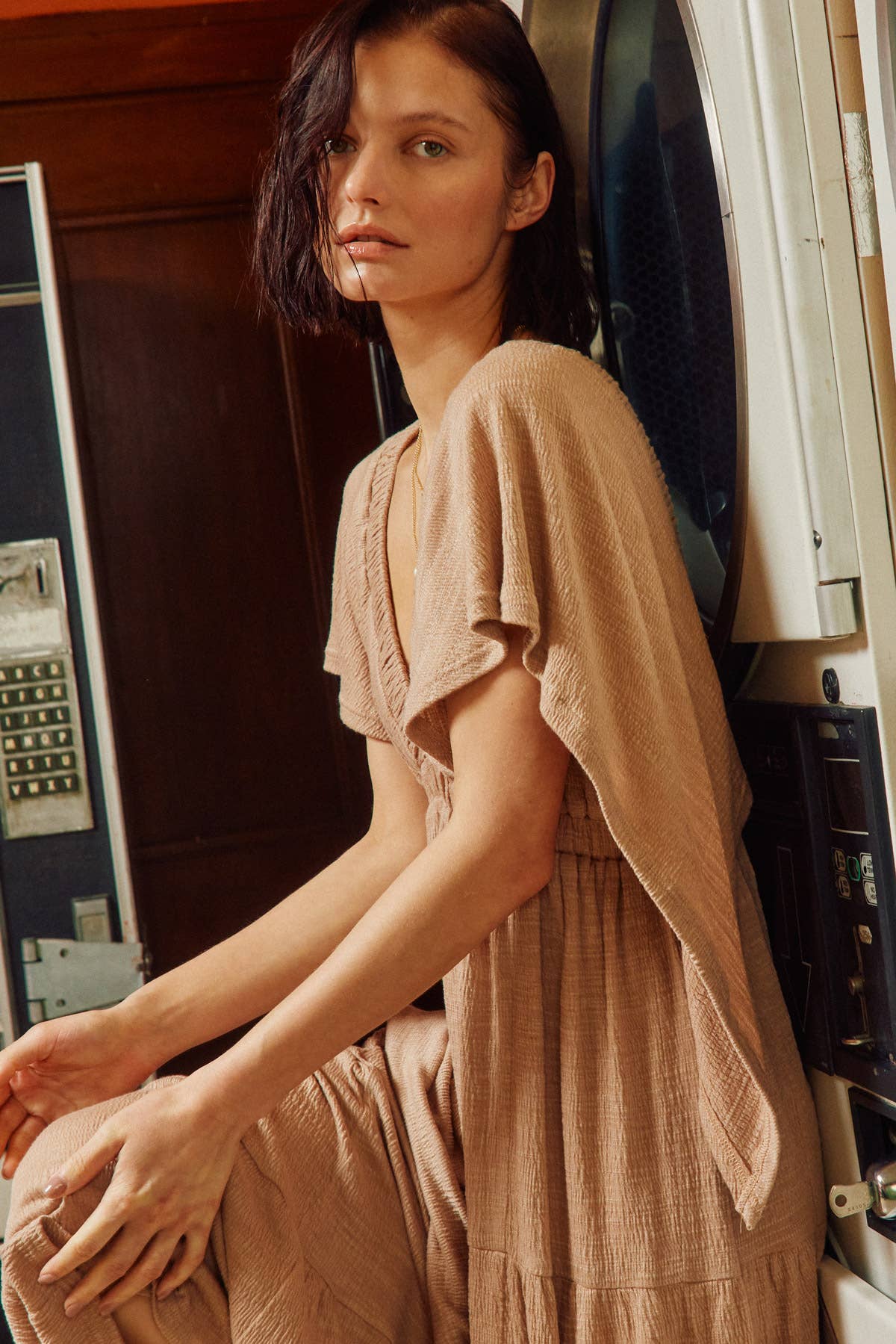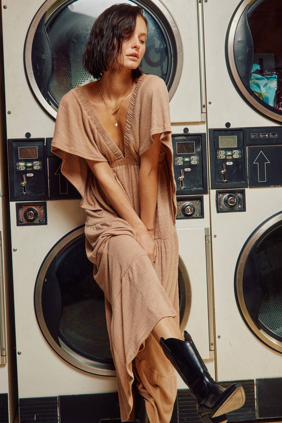 The textured V-neck maxi dress is a stylish and versatile garment that combines elegance with comfort. Its V-shaped neckline offers a flattering silhouette, accentuating the upper body, while the maxi length elongates the figure. The textured fabric adds depth and visual interest to the dress, providing a unique touch to the overall look. Perfect for various occasions, this dress can be dressed up with accessories and heels for a formal event or paired with sandals for a more casual, yet sophisticated, ensemble.
