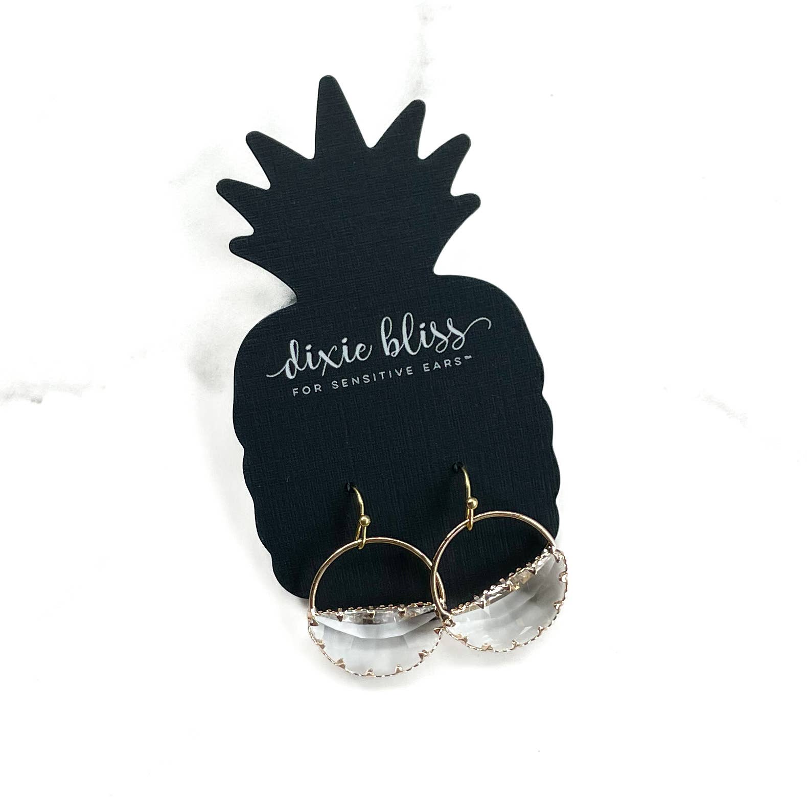 Earnestly Yours is classy and chic and features: *Simple Gold-toned Hook *Half-moon Faceted Glass Hoop *Measures 1.3" from the top *Hooks are Stainless Steel *Great for sensitive ears *Made in the USA Always wear rubber backs with dangle style earrings