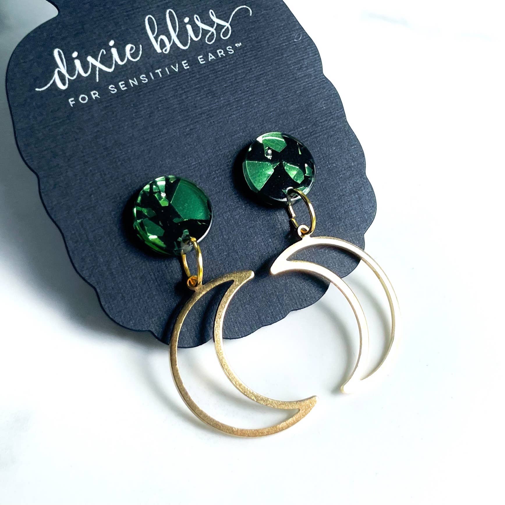 Moon Gazer is bewitching and features: *Venom Green Holographic Acrylic Stud *Vintage Brass Patina Open Crescent Moon *Measures 1.7" from the top *Posts are Stainless Steel *Great for sensitive ears *Made in the USA