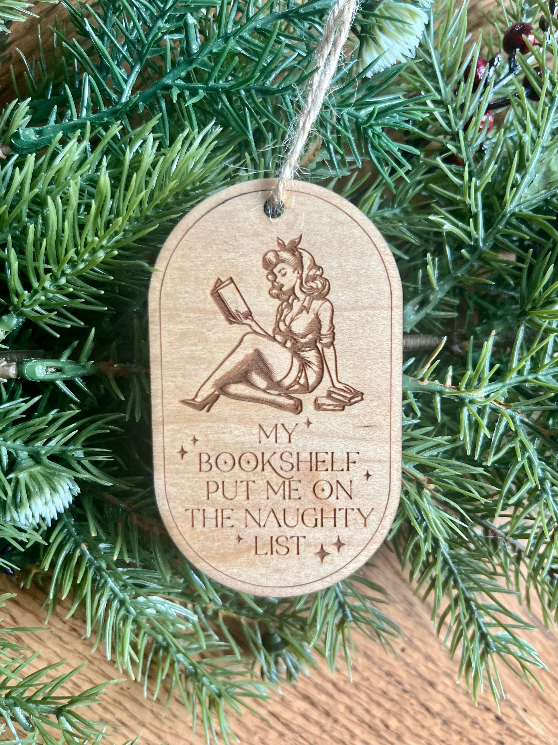 Perfect ornament for bookish lovers! This ornament comes with 2mm twine so that it can be put on the tree as soon as it gets to your door. |Ornament details| Size: 2.1"w x 3.5"h Wood: 1/4" thick maple plywood Stain color: Natural Handcrafted with care, this ornament reflects the artistry of handmade craftsmanship and the enduring allure of classic elegance. It's a perfect addition to your seasonal decorations, bringing a touch of refinement and storytelling to your home.