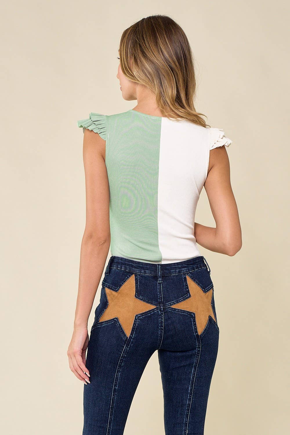 SOFT RIBBED COLOR BLOCK RUFFLED SLEEVE BODYSUIT WITH SNAP BUTTON CLOSURE #SPRING, SUMMER, CUTE BODYSUIT
