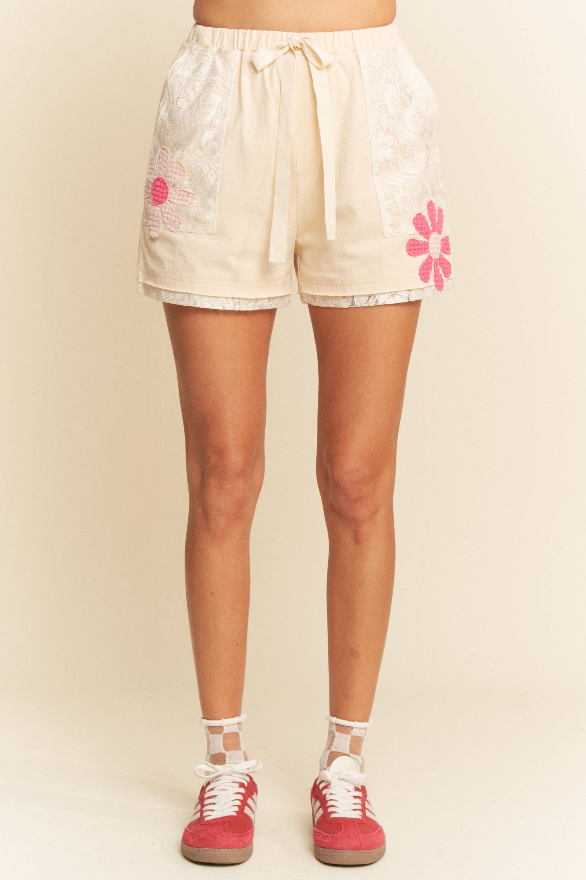 RIBBON TIE WAISTBAND FLORAL LACE DECORATIVE ACCENTED SHORTS Model is wearing Small Height: 5'10" Bust : 34 Waist : 25” Hips : 35”