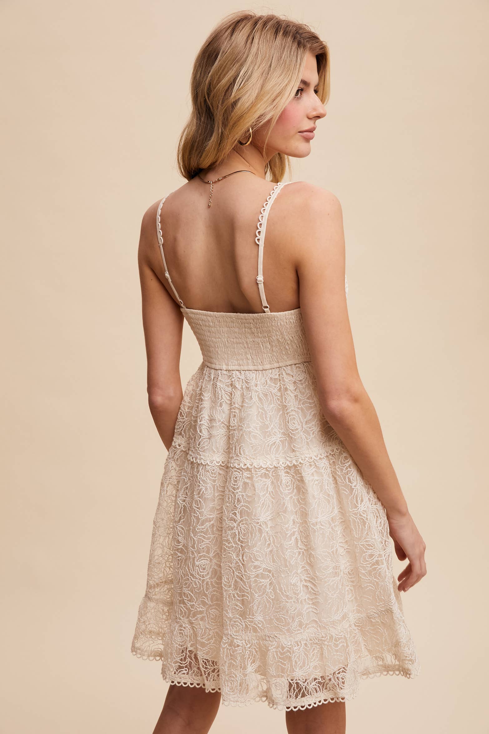 This floral lace tiered dress is perfect for garden parties, weddings, or a dreamy date night. Pair it with delicate heels and minimal jewelry for an effortlessly elegant look, or add a cropped cardigan for a chic layered style. Available in both light and dark color options to suit any occasion.
