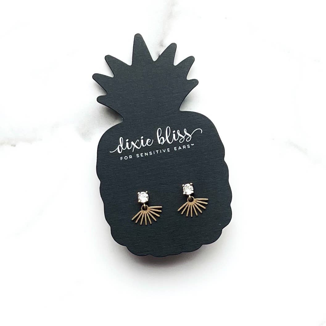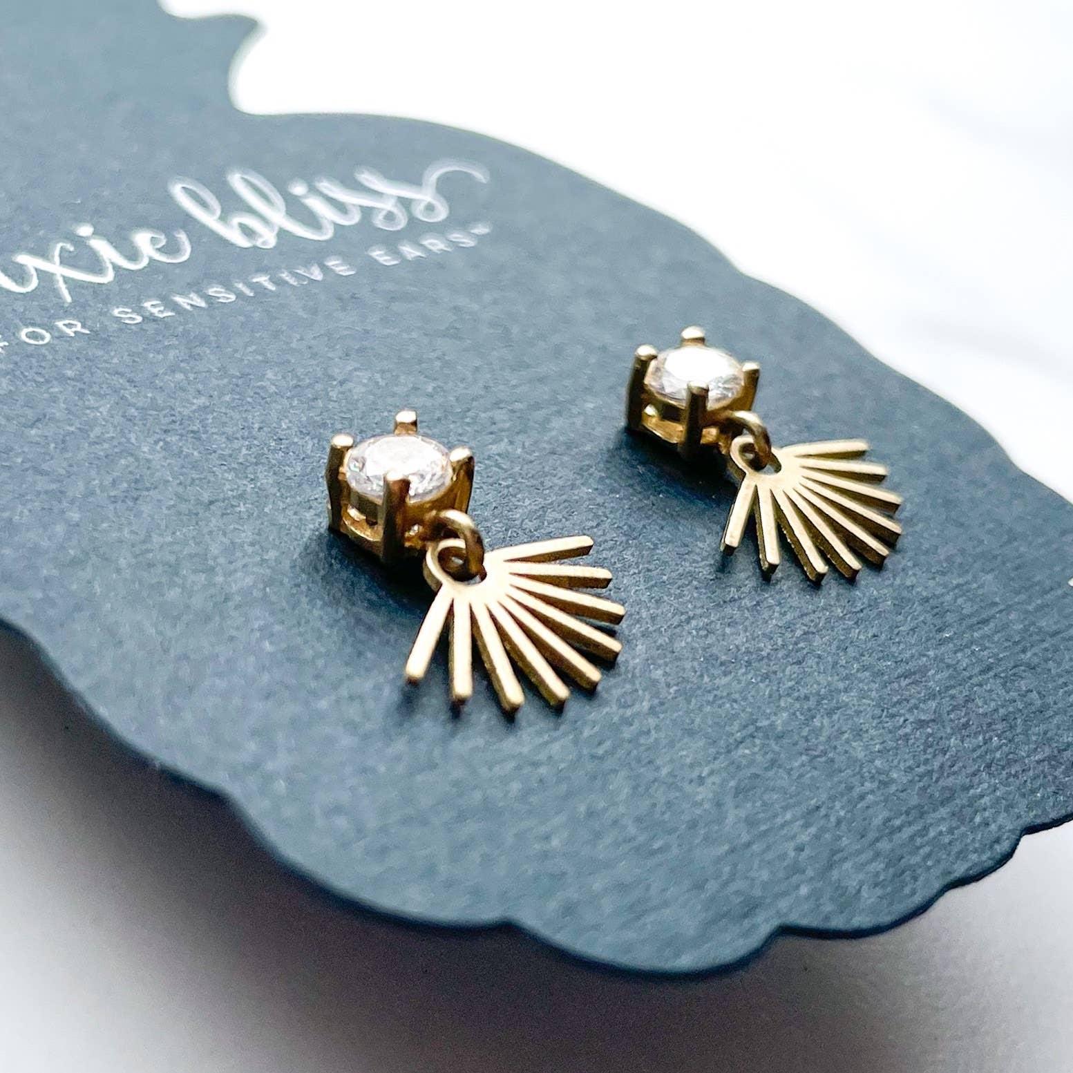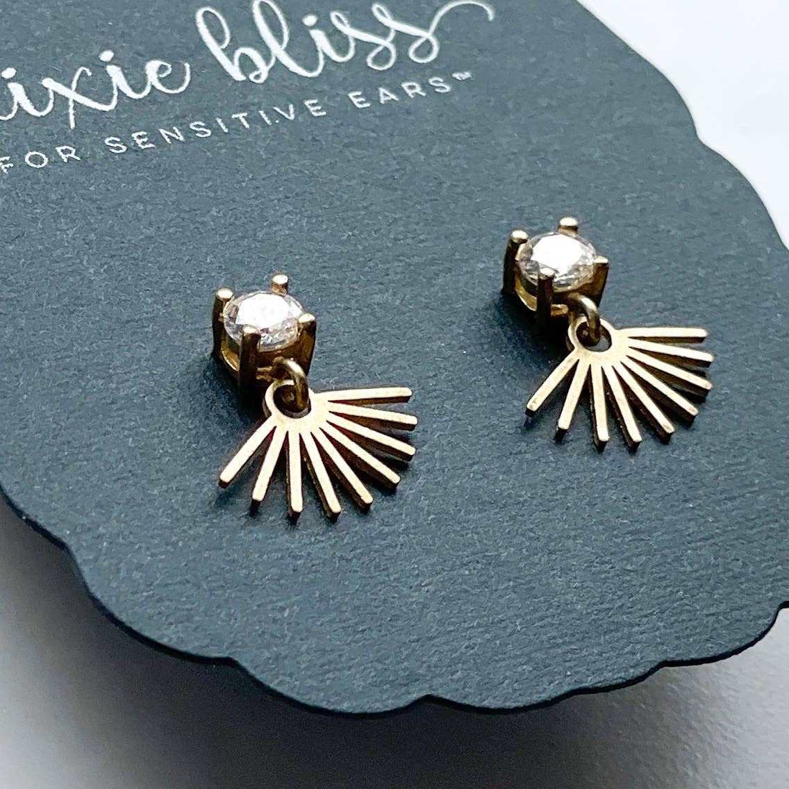 Scribe of Egypt is boho and features: *4mm CZ Post *Vintage Brass Patina Sunburst Fan *Measures 0.5" from the top *Posts are Stainless Steel *Great for sensitive ears *Made in the USA