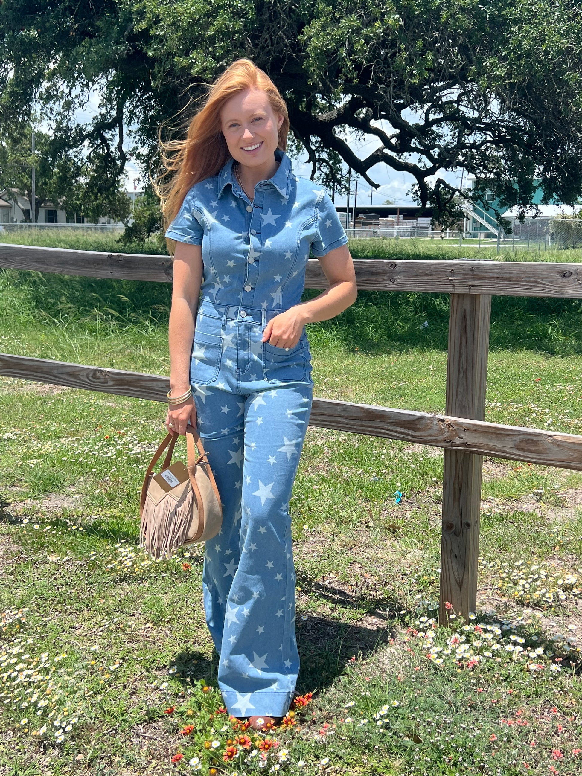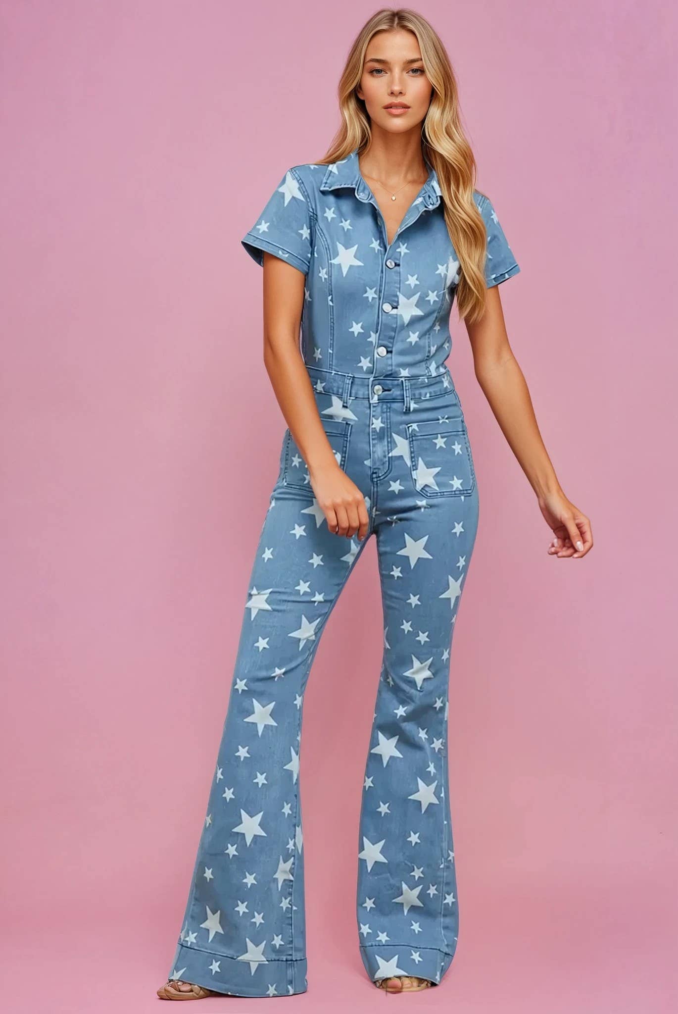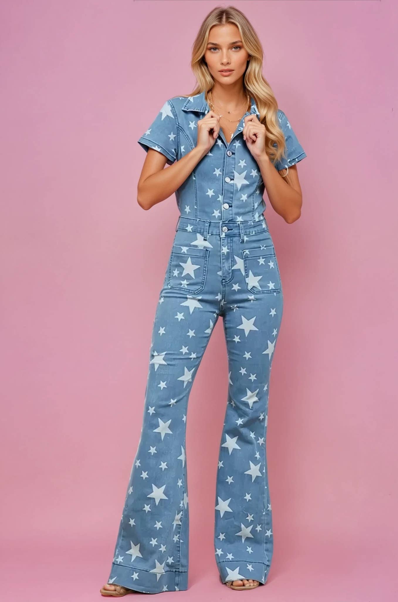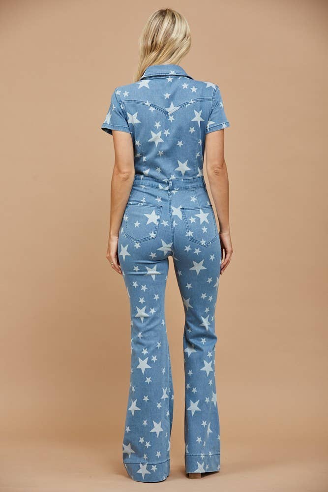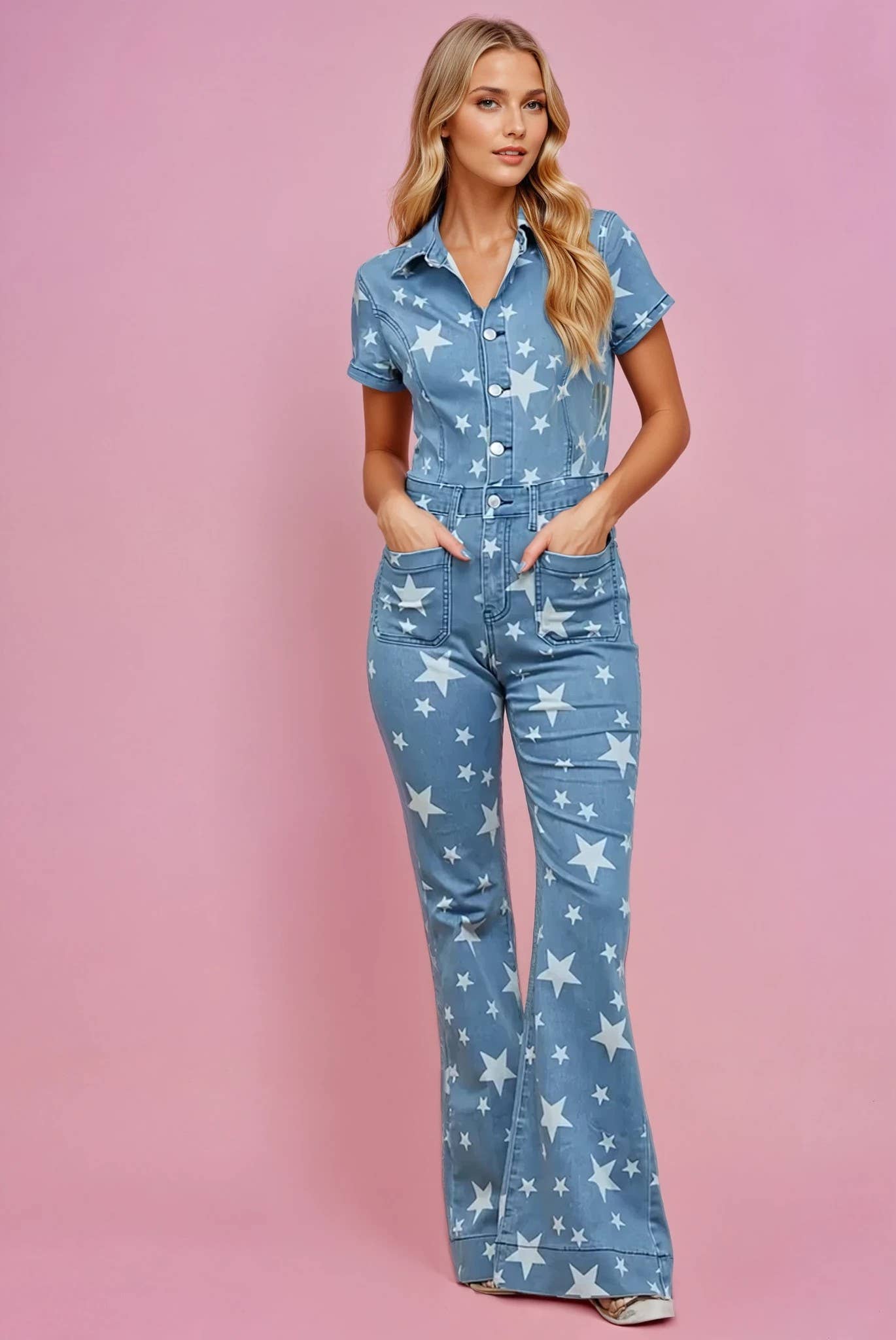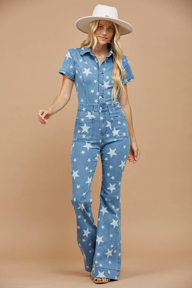 FULL LENGTH DENIM JUMPSUIT WITH FUNCTIONAL BUTTONS AND HIGH STRETCH INSEAM: 34" WAIST WIDTH: SMALL 27 "- 29"/ MEDIUM 29"-31" / LARGE 31"-33"