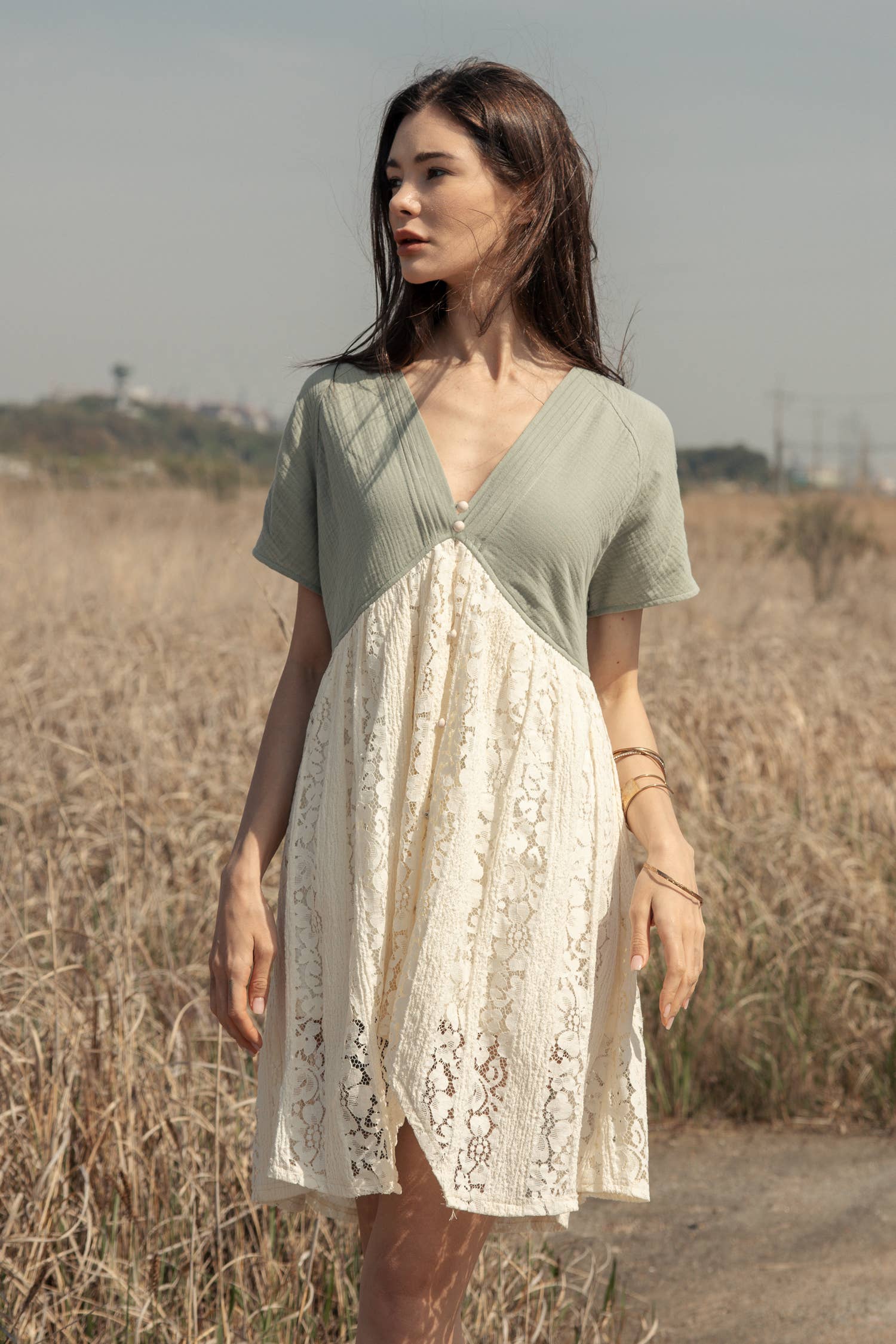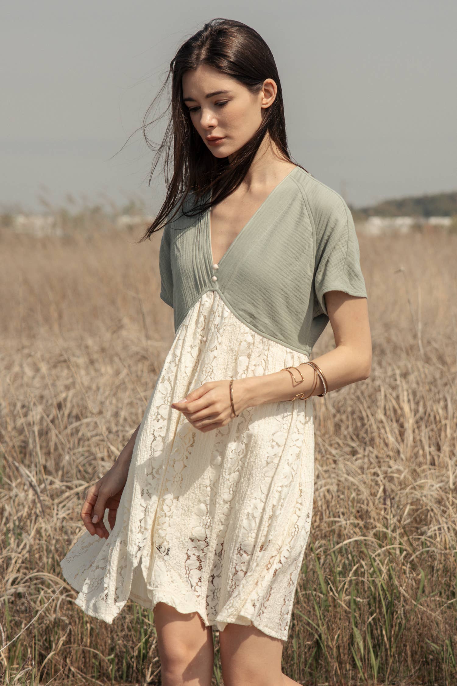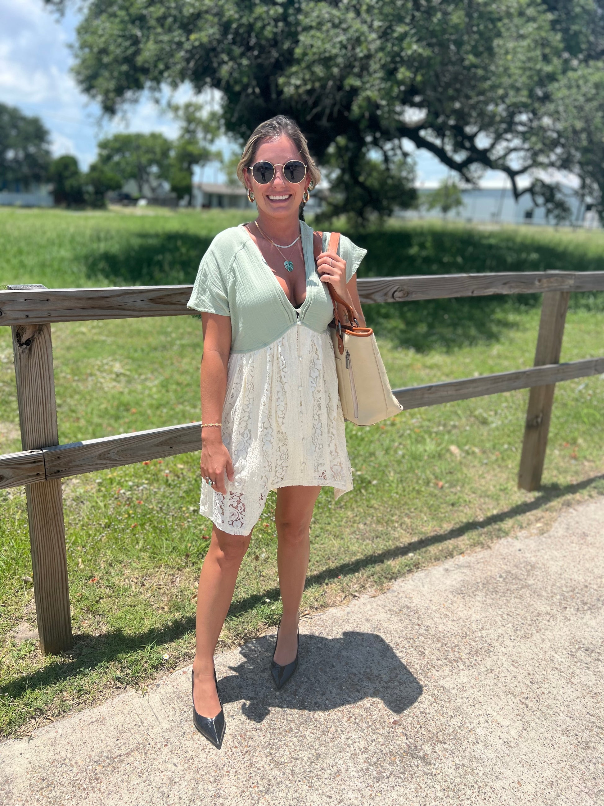 Color Block Mini Lace Dress: Mint/Ivory